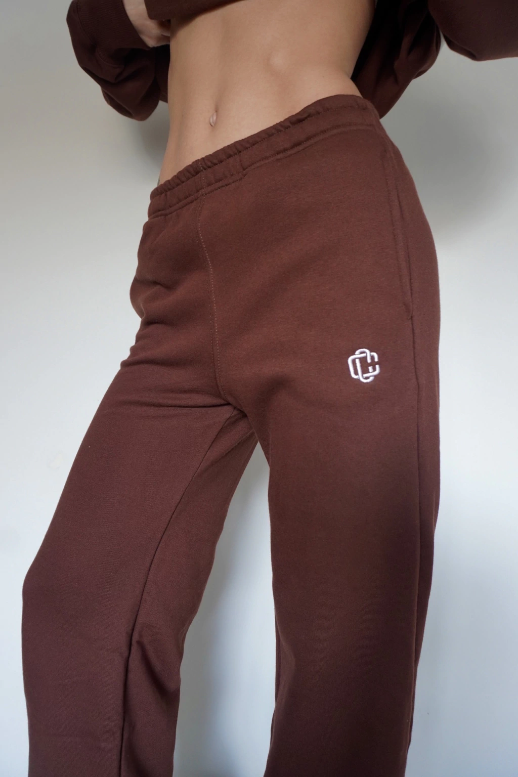 Jogging confeccionado en rústico con fit de pantalón recto, tiro alto, bolsillos delanteros, y vivos a contratono en laterales de piernas. Posee una estampa localizada de serigrafía en la pierna izquierda.